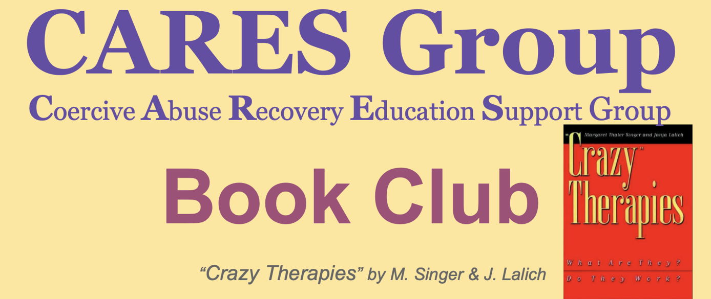CARES Group (Coercive Abuse Recovery Education Support) is offering an informal supportive book study club for those who have been unduly influenced by an individual or group. We will focus on books by leaders in the recovery field; suggestions are welcome. We strive to create a loving space for connection and reflection as we take steps to understand and heal from submission to authoritarian power over and learn to access the power within.