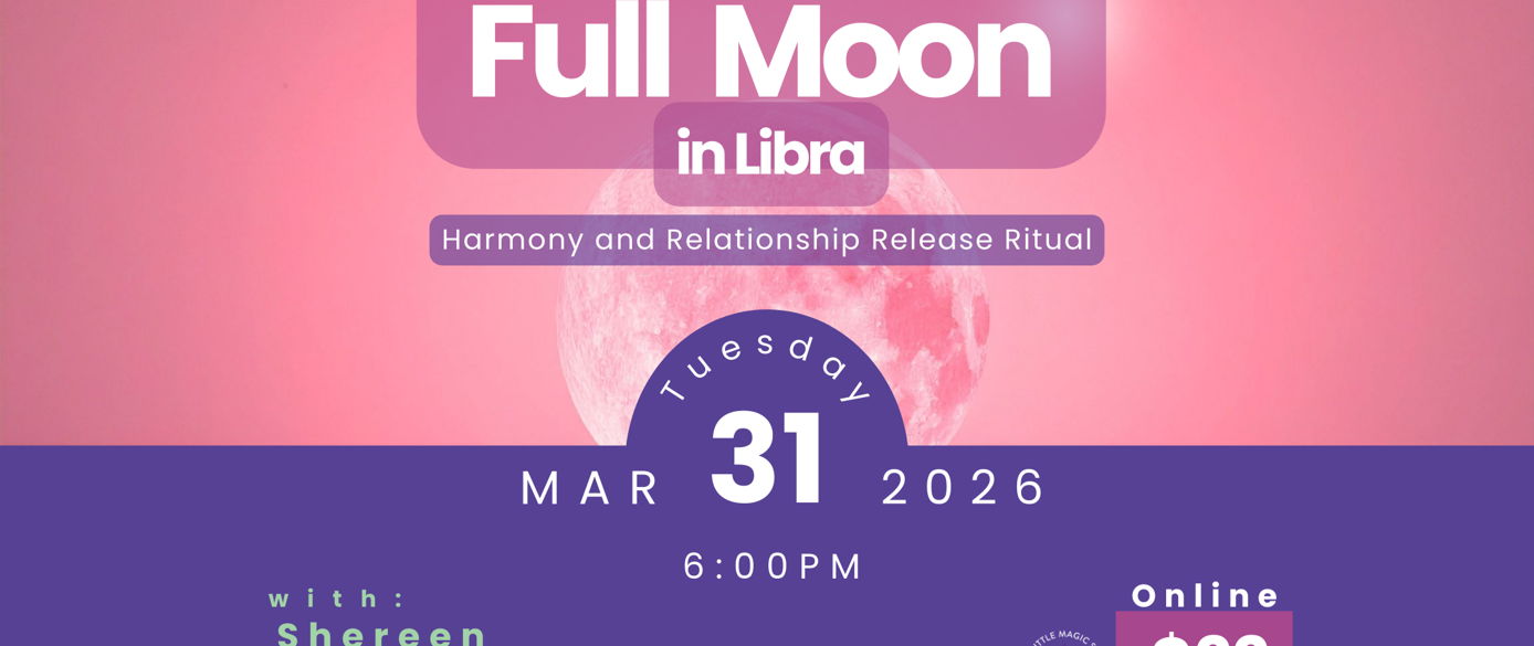 In this 90 minute online workshop on Zoom, Shereen guides you through the astrology of the Libra Full Moon including themes of beauty, peace, boundaries, justice, communication, and emotional restoration. You’ll explore how this full moon activates your personal chart and what truths are coming into the light for reflection.