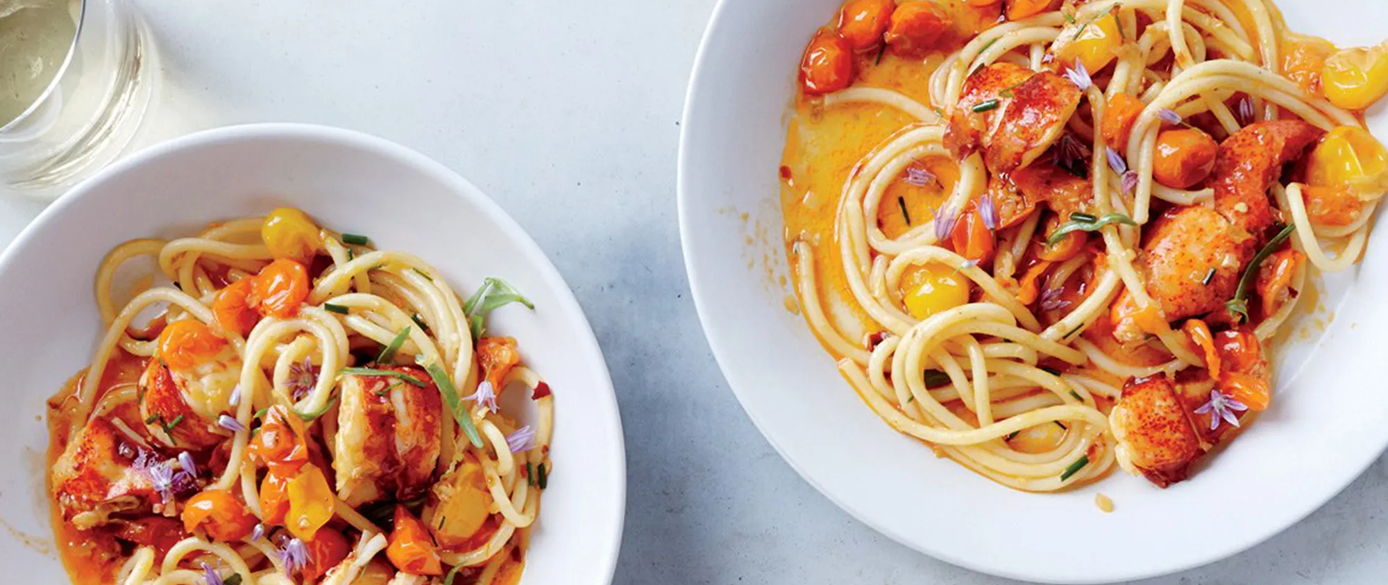 Spaghetti with lobster tail in a vodka-laced sweet cherry tomato broth with Mediterranean herbs