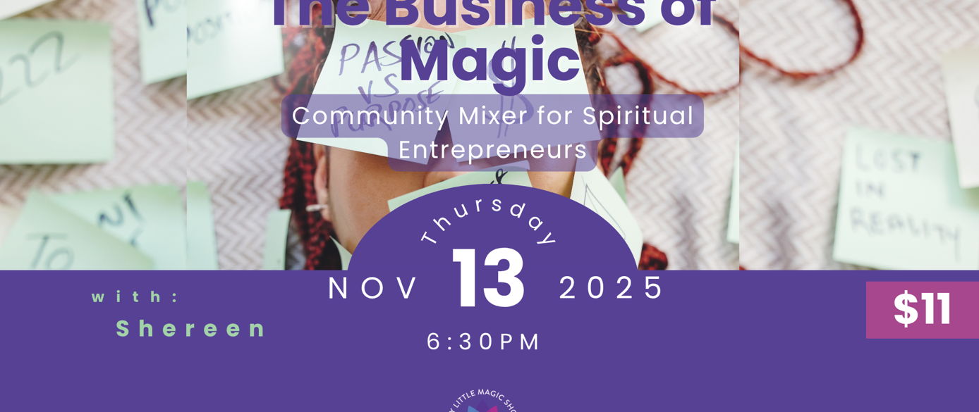 The Business of Magic is a monthly community mixer for spiritual entrepreneurs, healers, readers, teachers, and magical makers who want to connect, share wisdom, and support one another’s growth.
